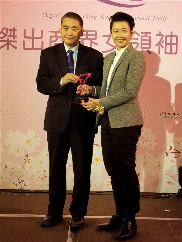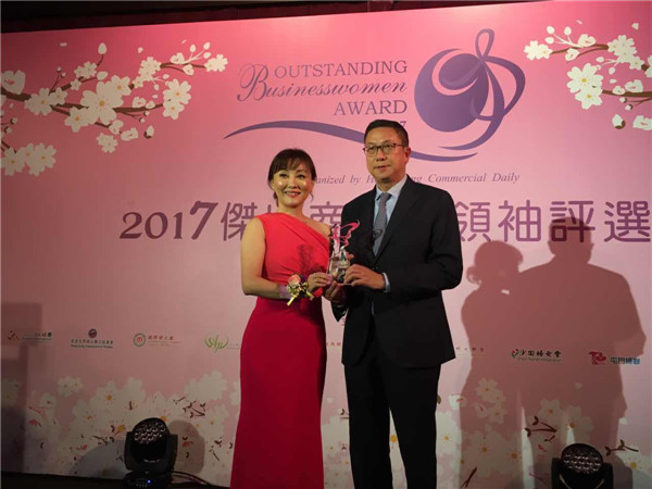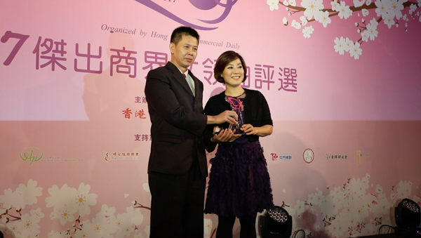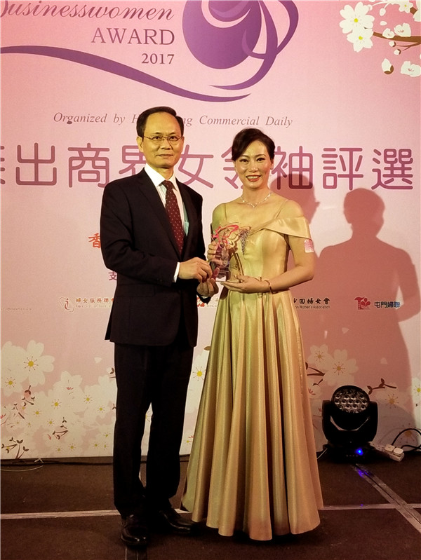 澳至尊國際創辦人及行政總裁蔡何家敏(左)從香港商務及經濟發展局署理局長陳百里(右)手上接過獎項。
