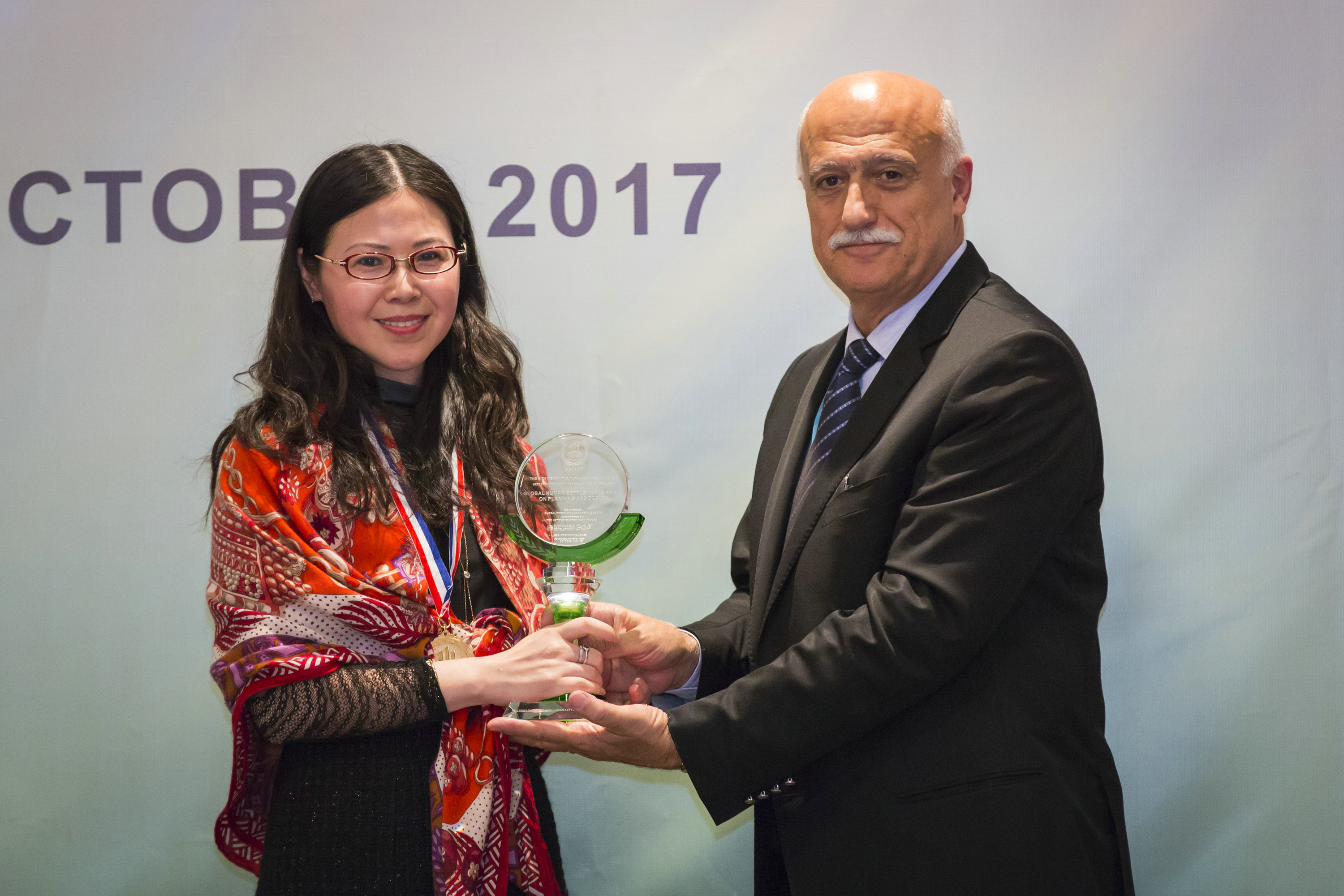 美国东部时间10月31日,2017可持续城市与人居环境奖(SCAHSA,以下简称“飒飒奖”)颁奖盛典在纽约隆重揭幕。联合国环境规划署可持续生活、城市和工业处前负责人阿拉布• 霍巴拉博士(右)向森林城市颁发“全球绿色建筑产业化示范园区”奖。