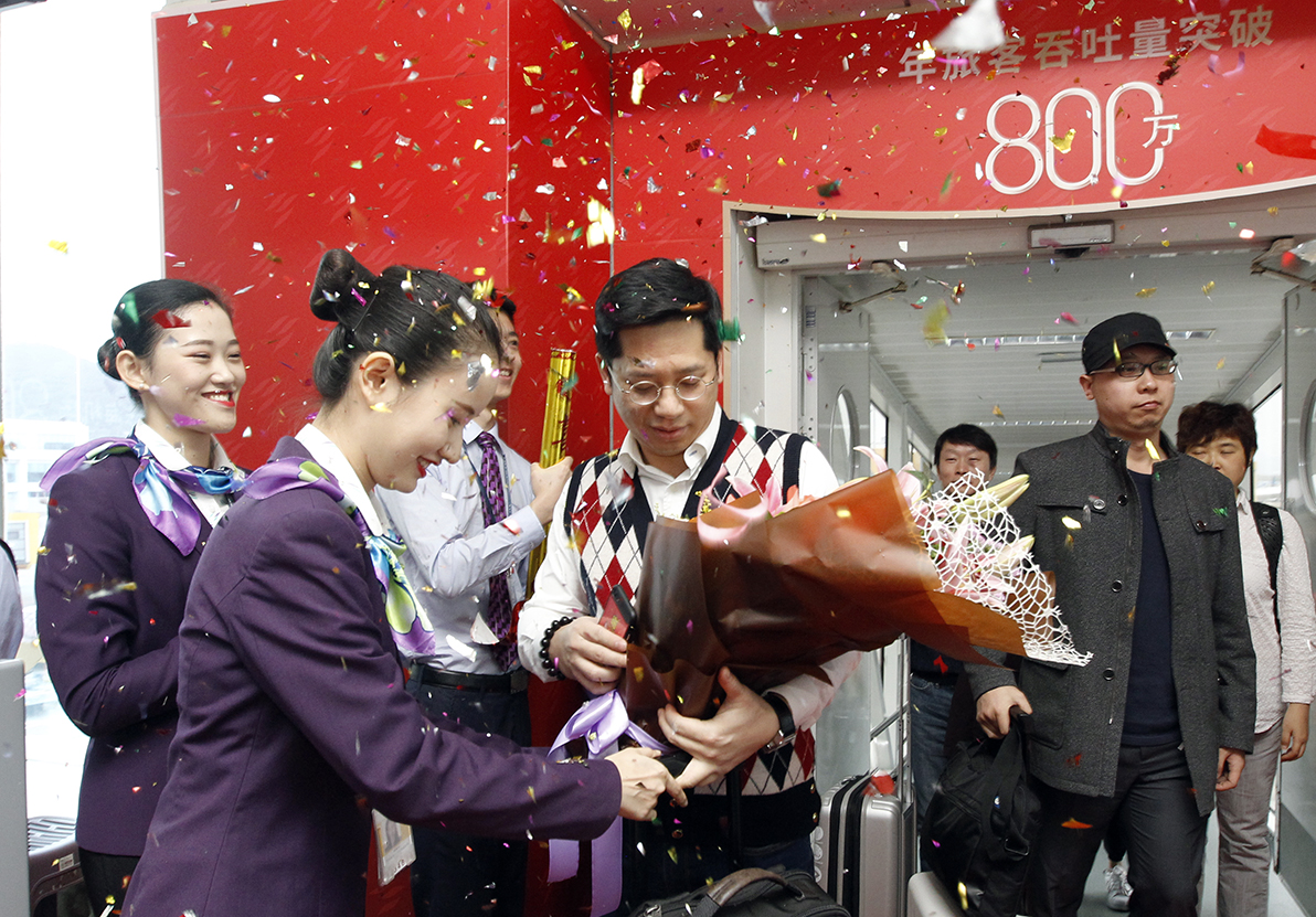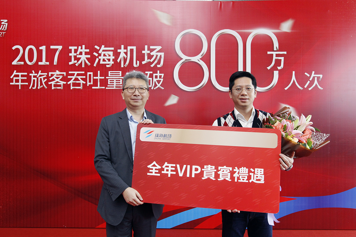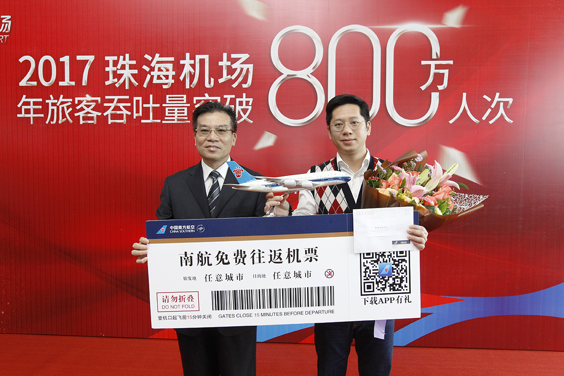 当日上午10:33,随着南航CZ3740北京-珠海航班缓缓降落在珠海机场,刚走出候机楼6号登机口的旅客陈坚便被献花和闪光灯包围,幸运地成为珠海机场2017年第800万名旅客。在接机仪式上,珠海机场与南航珠海公司分别赠与他“第800万名旅客”纪念牌、“珠海机场VIP贵宾厅全年免费卡”、机场纪念礼品及南航始发任意航点往返程免费机票一套。同时,此次航班的所有旅客也获赠精美纪念礼品一份。