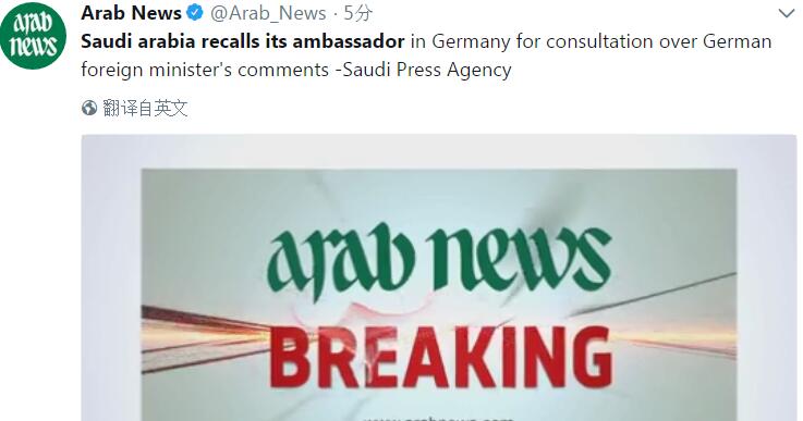 据阿拉伯新闻网援引沙特通讯社消息,在德国外长发表对沙特的不当言论后,沙特阿拉伯召回其驻德国大使以便进行磋商。据悉,德国外交部长此前暗示沙特方面扣留了黎巴嫩总理哈里里。沙特通讯社援引外交部消息人士的话称,德国外长在会见黎巴嫩外长时发表的言论并非基于真实的信息。