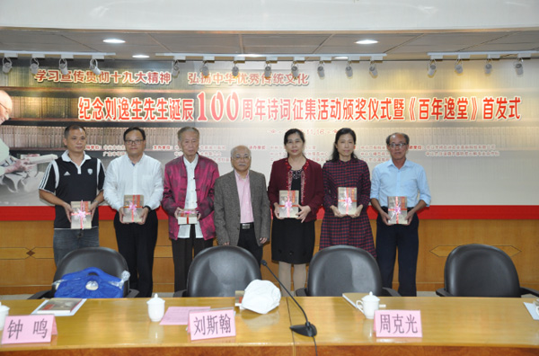 【香港商报网讯】记者焦家志 通讯员黄泽强报道:11月16日下午,中山市沙溪镇人民政府为纪念我国著名古典文学专家、诗人刘逸生先生诞辰100周年,举行了“纪念刘逸生先生诞辰100周年诗词征集活动颁奖仪式暨《百年逸堂》首发式和诗书画展活动”,以此缅怀这位优秀的沙溪人。刘逸生次子、岭南著名诗人、中国古典文学研究专家刘斯翰,广东中华诗词学会副会长周克光,中山市政协文化和文史资料委员主任刘秀莲,中山市文联专职副主席冯福禄以及沙溪镇相关领导和人员近百人出席了活动。