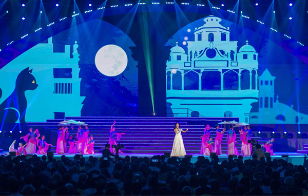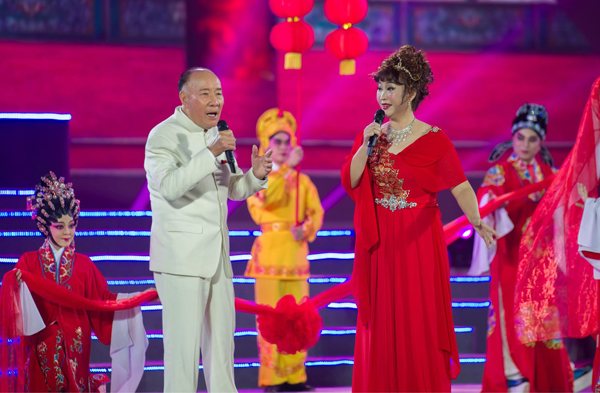 黎子流、余阳丽演唱粤剧名段《花好月圆》,寓意中国侨都江门和世界广府人花好月圆、幸福满满。