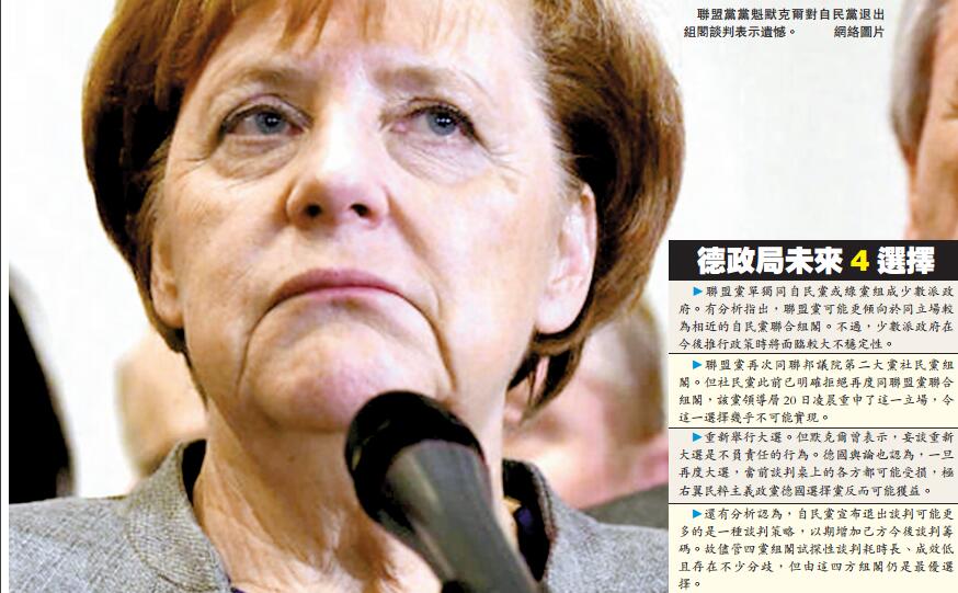 重新舉行大選。但默克爾曾表示,妄談重新大選是不負責任的行為。德國輿論也認為,一旦再度大選,當前談判桌上的各方都可能受損,極右翼民粹主義政黨德國選擇黨反而可能獲益。