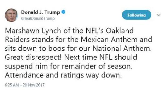 据美国中文网报道,特朗普20日清晨发推说,“马肖恩·林奇,NFL奥克兰突袭者队的球员,在奏墨西哥国歌时站着,但在奏我们国歌时却坐着。这是极大的不尊重!NFL应该给他整季禁赛,(NFL)的入座率和收视率都下降了。”