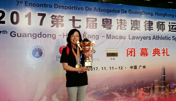 【香港商報网訊】2017第七屆粵港澳律師運動會日前在廣州圓滿閉幕。香港律師譚玉瑜在女子游泳比賽中勇奪金銀銅三項獎牌。參賽的律師運動員總人數達368人,香港代表隊參賽律師80人左右,廣東代表隊獲得團體冠軍。
