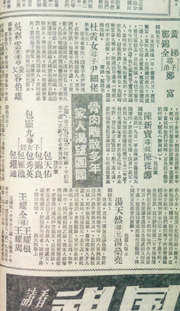 例如有一位年輕人來找母親,只記得小時候住處好像有條斜路,又有個滅火桶。《商報》記者便按他所說的寫了出來,居然有人來認,說︰「我住的那里就是這樣的,我媽媽現在在深圳,看看你要不要來深圳,讓我媽看看你吧?」記者跟他們兄弟倆去了深圳,那位媽媽一看年輕人,就叫了一聲:「真是我生的。」一家人就相認,抱頭痛哭,場面感人。