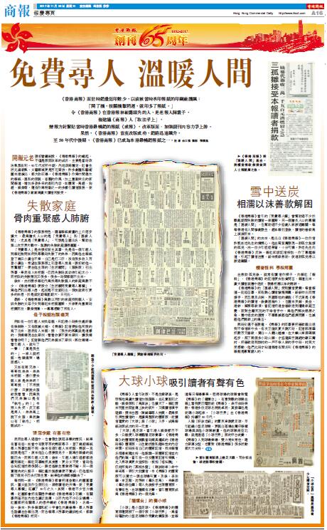 每找到一家,《香港商報》都會把這些動人的團圓喜訊,圖文并茂作全版刊出,深得讀者的共鳴,使「免費尋人專欄」延續了30年之久。其間,香港不少官方機構、社團都會把有關信件轉給《香港商報》刊載,有關事例甚至在內地也廣泛流傳,以至內地不少公安機構、社團都把有關尋人的信件轉給《香港商報》,名噪一時。后來,許多報章和紅十字會也共襄善舉,尋人啟事也陸續在各報出現,而各報尋人啟事的編排格式,都跟《香港商報》相同。