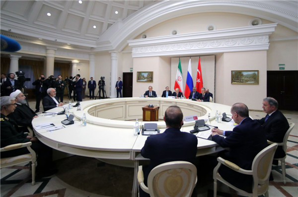 據俄羅斯總統網站消息,三國領導人當天在聯合聲明中說,經過國際社會數年努力,盤踞在敘利亞的極端組織“伊斯蘭國”、“征服陣線”等已經基本被消滅,未來俄土伊三國將繼續致力於完全鏟除敘境內極端組織。
