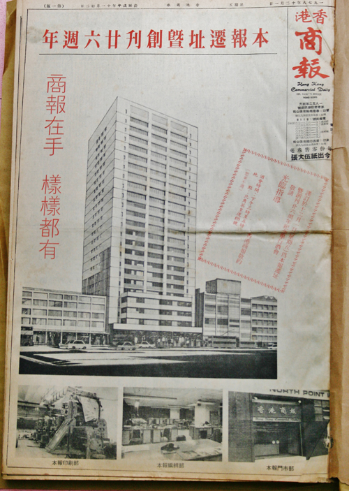 1978年12月1日,《香港商報》頭版刊登了本報遷往北角工業大廈暨創刊二十六周年的消息。一句「商報在手樣樣都有」標語,醒目幽默。
