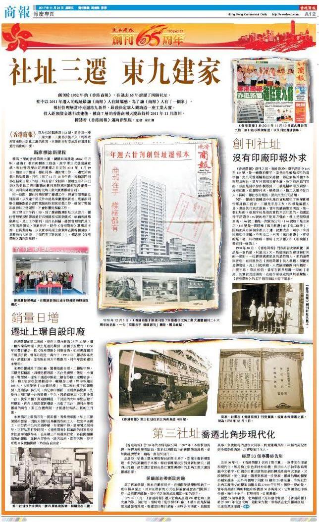 創刊於1952年的《香港商報》,在過去65年經歷了四個社址,當中以2011年遷入的現址最讓《商報》人有歸屬感。為了讓《商報》人有「一個家」,報社管理層當時走遍港九新界,最后決定購入觀塘道一座工業大廈,投入鉅額資金進行改建后,樓高7層的香港商報大廈最終於2011年11月啟用,標誌着《香港商報》邁向新里程。記者 余江強