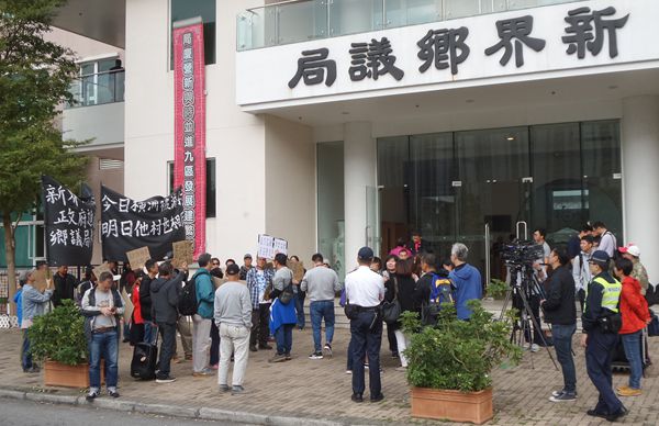 來自橫洲永寧、鳳池及楊屋村的3條非原居民村逾20名村民,昨午2時許於鄉議局大樓門外示威,他們手持橫額「強行滅村、今日三村、明日他村」並高呼口號。永寧村村代表陳愛金表示,政府決定收回橫洲土地發展公屋,其收地耗費24億港元,包括興建道路,卻不肯花錢安置村民。他指出,現時3條村約150多戶,只有約9戶獲編配公屋單位,70多戶仍審核中,餘下的70多戶則未有登記,明年1月便是村民遷出的期限,他們要求鄉議局向政府爭取原區安置及賠償。
