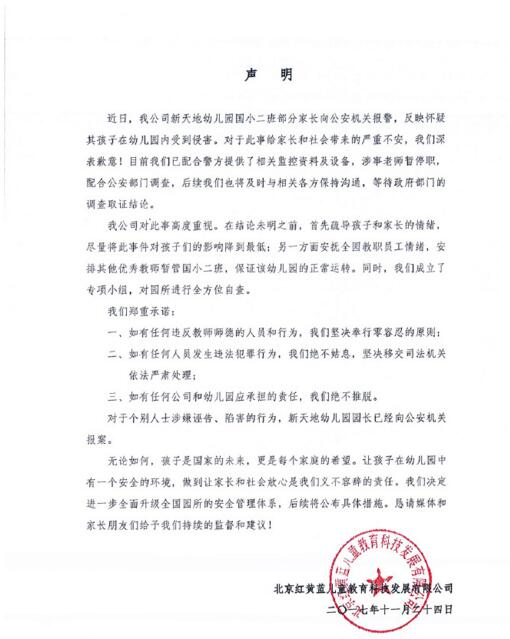 11月23日,网上流传北京红黄蓝幼儿园新天地园区存在猥亵、针扎幼儿,给幼儿喂食、注射不明药物等行为。