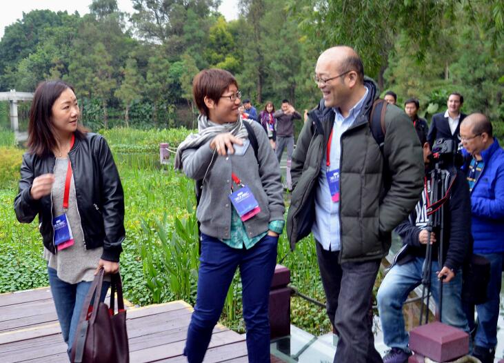 11月25日下午,世界主流媒体广州采风团记者参观采访海珠国家湿地公园,日本经济新闻社记者(左一、左三)与新加坡海峡时报记者(左二)谈笑风生。