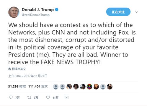 俄罗斯卫星通讯社11月28日报道称,特朗普在推特上说:“我们应该办场比赛,算上美国有线电视新闻网(CNN)但不包括福克斯新闻频道(Fox News),有哪些公司最卑劣、最腐败或在政治方面最扭曲地形容你们最爱的总统(我)。”
