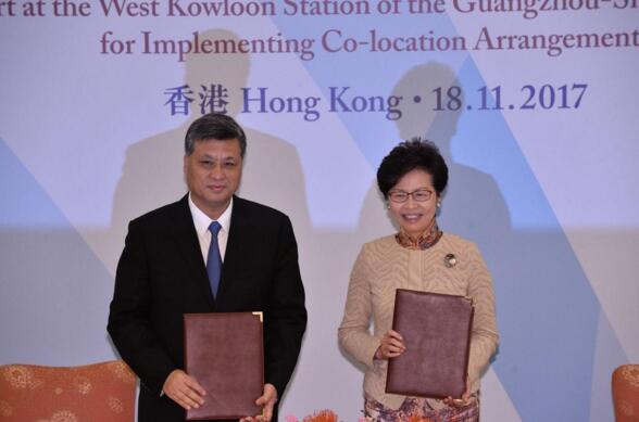 林鄭月娥與馬興瑞簽署「一地兩檢」合作安排。資料圖