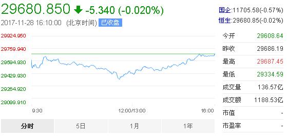 恒生指数今早低开低走,盘中跌幅一度收窄至仅跌19点,随后再度下挫。午后恒指突然跳水,最低跌逾350点,低见29334点,跌穿上午低位,后于收市前回升至29680点水平附近。截至收盘,恒生指数跌0.02%,报29680.85点;国企指数跌0.57%,报11705.58点;红筹指数涨0.05%,报4342.49点。大市成交额1188.53亿。