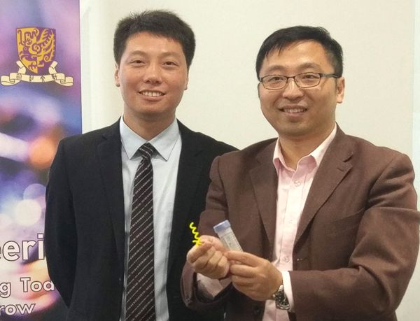張立教授(右)與鄢曉暉博士(左)利用天然螺旋藻研發生物合成微型機械人。
