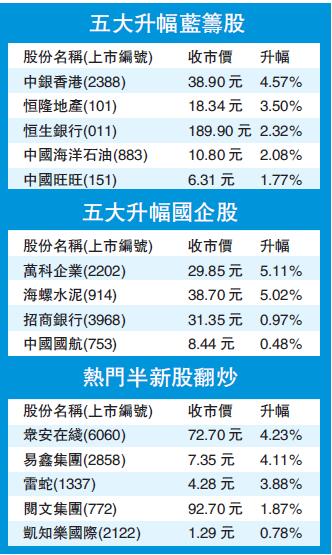 強勢藍籌獲利回吐,瑞聲科技(2018)、中國平安(2318)及騰訊(700)合共拖低恒指105點,資金轉炒銀行股及資源股,其中中銀香港(2388)飆4.6%,是表現最佳藍籌;恒生銀行(011)升2.3%;滙豐控股(005)連升4日,收報78元升1.3%,合共抵銷恒指68點跌幅。內地水泥價格強勁帶動盈利,水泥股升勢明顯,海螺水泥(914)、中材股份(1893)、中國建材(3323)齊創52周新高;鋼鐵股鞍鋼股份(347)亦破頂,收市升2.6%報7.79元。