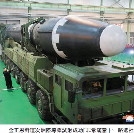 與此同時,朝鮮國營電視台昨天播出「火星15型」導彈的發射過程。報道稱,今次試射確認了系統在戰鬥環境能夠可靠運作,和彈頭重返大氣層的可靠性。金正恩對試射成功「非常滿意」。朝鮮方面還聲稱,今次試射確認彈頭能重返大氣層,過往有專家稱,朝鮮在這項關鍵技術上遇到困難,預料平壤仍需要最少一至兩年時間才能取得突破。而朝鮮方面暫未提供證據證實有關說法。