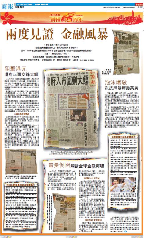 《香港商報》創刊65年以來,香港經濟總體蒸蒸日上,惟其間仍面對多番起跌。其中,1998年亞洲金融風暴及2008年全球金融海嘯,兩度令香港經濟錄得負增長。不過,「柳暗花明又一村」,每逢危機過后,香港股市樓市總會絕地翻身、再創高峰。作為香港主流財經傳媒,《香港商報》是一個極好的見證者、記錄者。記者 鄺偉軒 攝 張穎胤