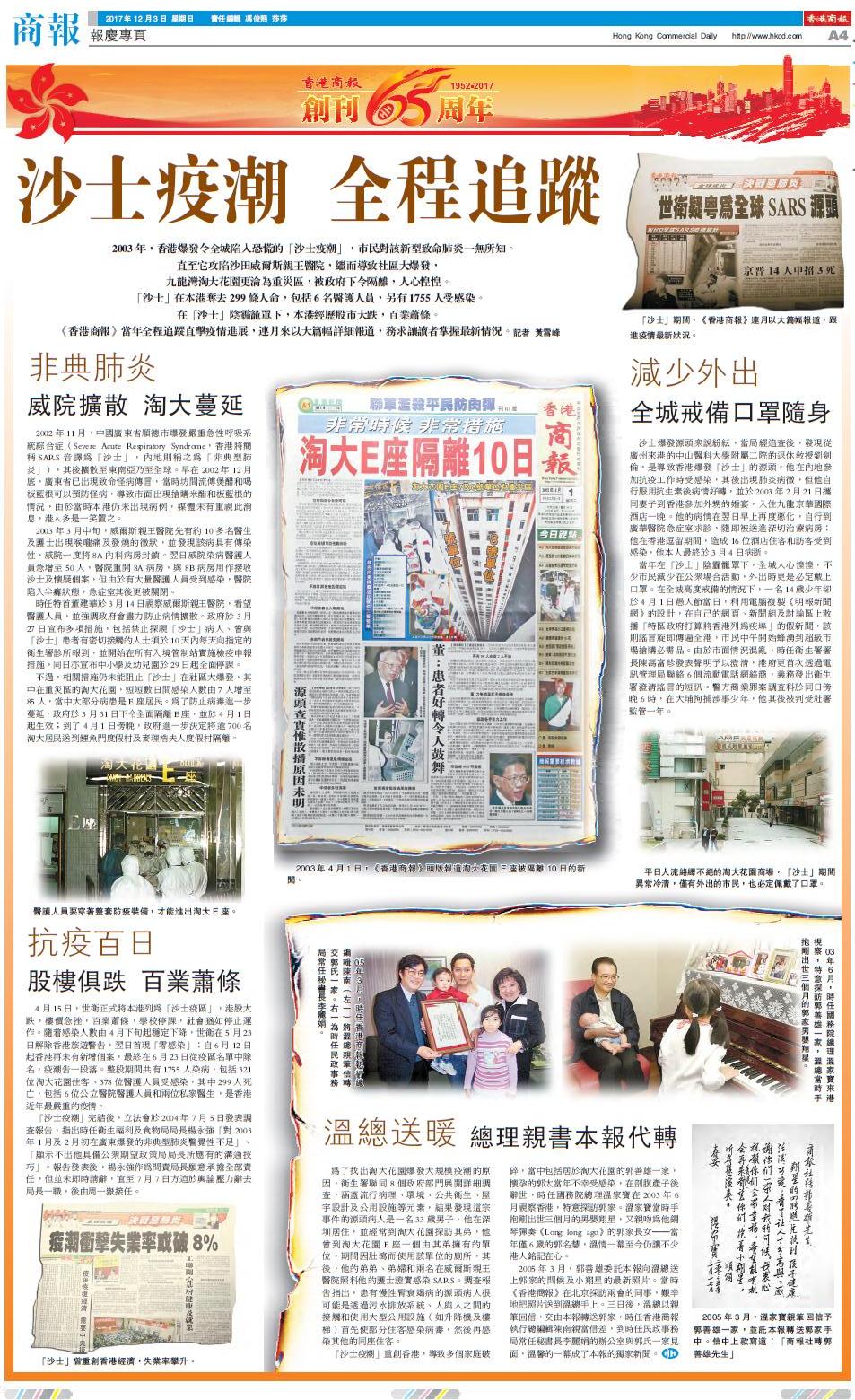 2003年,香港爆發令全城陷入恐慌的「沙士疫潮」,市民對該新型致命肺炎一無所知。直至它攻陷沙田威爾斯親王醫院,繼而導致社區大爆發,九龍灣淘大花園更淪為重災區,被政府下令隔離,人心惶惶。「沙士」在本港奪去299條人命,包括6名醫護人員,另有1755人受感染。在「沙士」陰霾籠罩下,本港經歷股市大跌,百業蕭條。《香港商報》當年全程追踪直擊疫情進展,連月來以大篇幅詳細報道,務求讓讀者掌握最新情况。