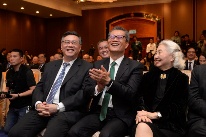 今年年初举办的「2016商界10大關注」评选颁奖礼,香港商报社长陈寅(左)与财政司司长陈茂波(中)及香港基本法委员会副主任梁爱诗(右)开怀大笑。