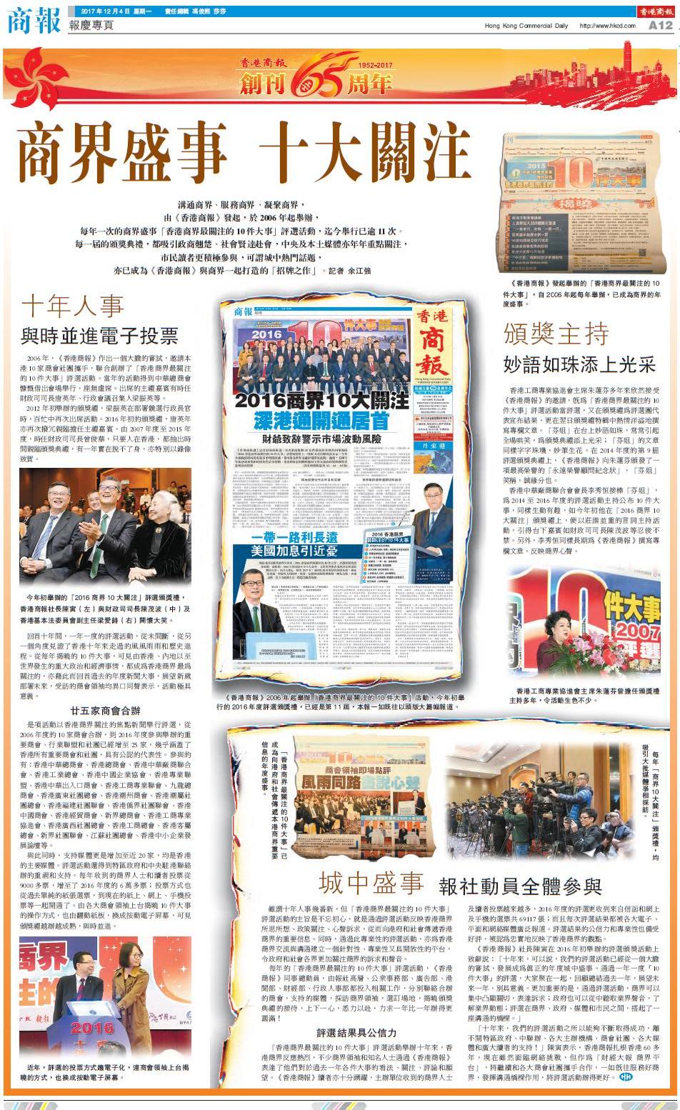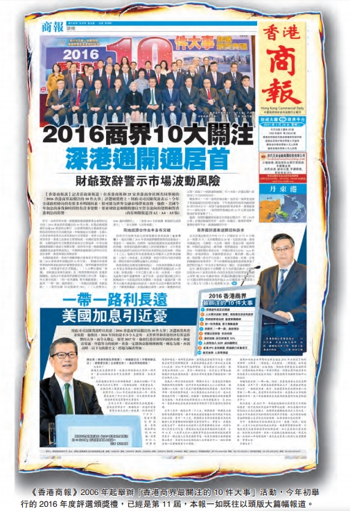2006年,《香港商報》作出一個大膽的嘗試,邀請本港10家商會社團攜手,聯合創辦了「香港商界最關注的10件大事」評選活動。當年的活動得到中華總商會慷慨借出會場舉行,座無虛席。出席的主禮嘉賓有時任財政司司長唐英年、行政會議召集人梁振英等。