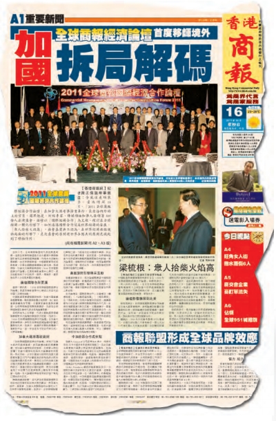 2011年10月14日,「全球商報聯盟」首度移師海外,在加拿大溫哥華隆重舉行,以「國際經濟合作」為主題,探討在全球經濟一體化形勢下,如何通過國際合作促進世界經濟的發展。而本次論壇更成為溫哥華新會展中心建成以來首次由中國人主辦的活動,深感榮幸。至此,聯盟成員也由最初的17家增至現在的47家。
