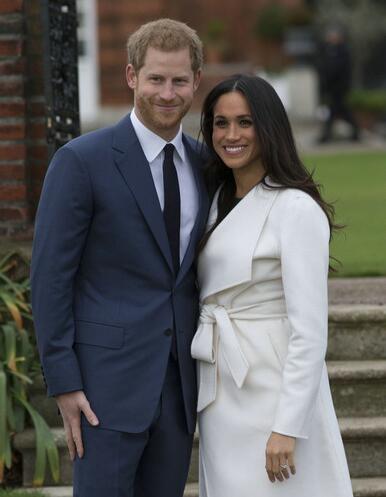 资料图片:11月27日,在英国伦敦肯辛顿宫,哈里王子(左)与梅根·马克尔接受拍照。新华社