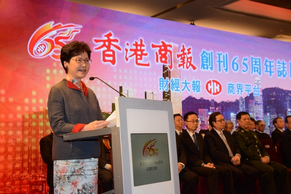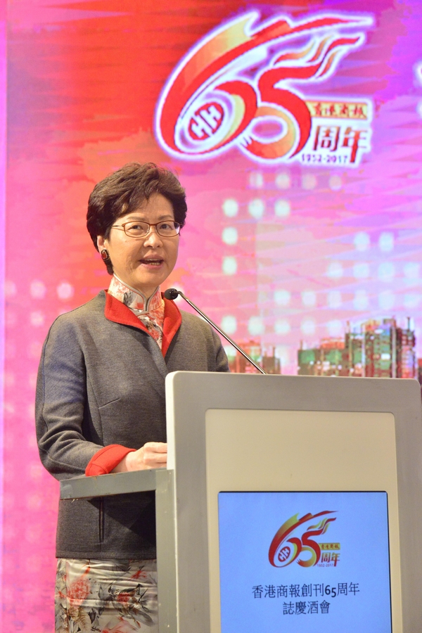 林鄭月娥代表香港特別行政區政府祝賀香港商報生日快樂,事業蒸蒸日上。她說,商報一直以香港為家,65年來為香港人服務,秉持「為商界代言,為商家服務」的宗旨,重點刊登各類與香港經濟形勢緊密相關的新聞、分析香港商人關心的熱點問題,以及報道鄰近地區的重要政策和經濟信息等。多年來,商報為讀者提供了無數的經貿信息,促成了大大小小的交易和投資項目,間接推動香港的經濟發展,可謂貢獻良多。