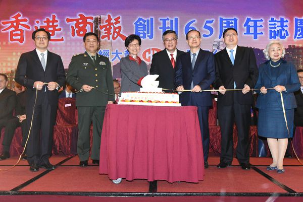 行政長官林鄭月娥(左三),中聯辦副主任楊健(左五),外交部駐港特派員公署副特派員宋如安(左六),中國人民解放軍駐港部隊參謀長何啟茂(左二),全國人大常委會香港基本法委員會副主任梁愛詩(左七),深圳市委常委、宣傳部部長李小甘(左一)和香港商報社長陳寅一同主持切蛋糕儀式,慶祝商報65歲華誕。 記者 馮瀚文攝