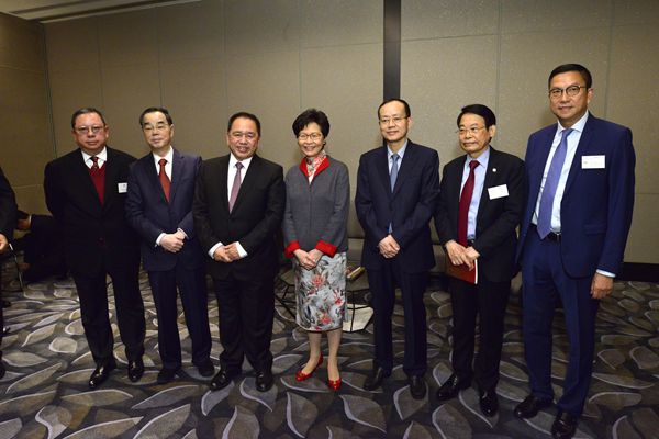 行政長官林鄭月娥(左三),深圳市委常委、宣傳部部長李小甘(左二),香港商報社長陳寅(左四)和香港商報董事局常務副主席黃偉合影。記者 馮俊文攝