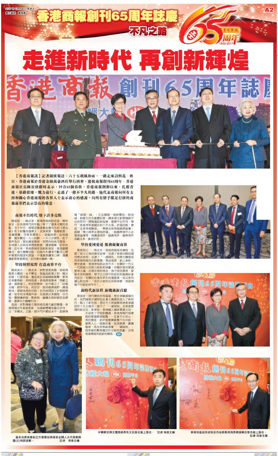 陳寅指出,一路走來,香港商報風雨兼程,見證了東方之珠的傳奇故事,見證了香港回歸祖國的歷史時刻,見證了「一國兩制」的偉大構想成為香港特區的生動實踐。筆底風雲,紙上春秋,歷史滄桑,香港商報能走到今天,有賴於一代又一代商報人的努力耕耘和奉獻;有賴於堅持愛國愛港立場、在商言商的理念,恪守堅持真理、實事求是的報格,堅守公正持平的原則和服務社會的宗旨;有賴於社會各界和在場嘉賓一直以來的關心和支持,「沒有大家的支持與厚愛,香港商報不可能走到今天!」。