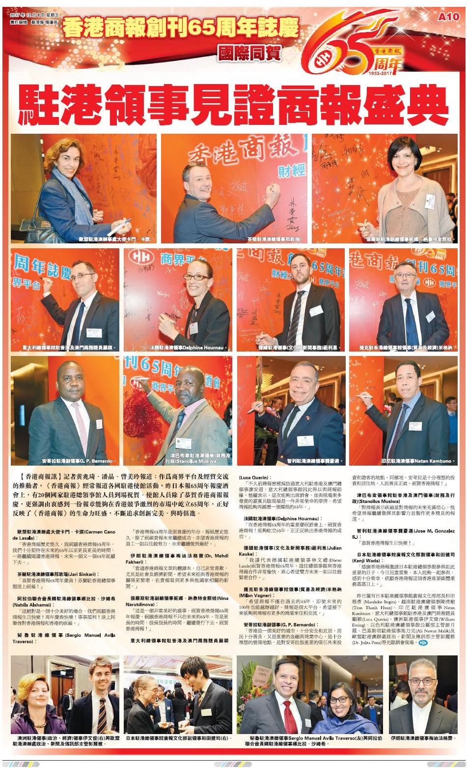 【香港商報网訊】記者黃兆琦、潘晶、曾美玲報道:作為商界平台及經貿交流的推動者,《香港商報》經常報道各國駐港使館活動,昨日本報65周年報慶酒會上,有20個國家駐港總領事館人員到場祝賀。使館人員除了恭賀香港商報報慶,更強調由衷感到一份報章能夠在香港競爭激烈的市場中屹立65周年,正好反映了《香港商報》的生命力旺盛,不斷追求創新完美、與時俱進。