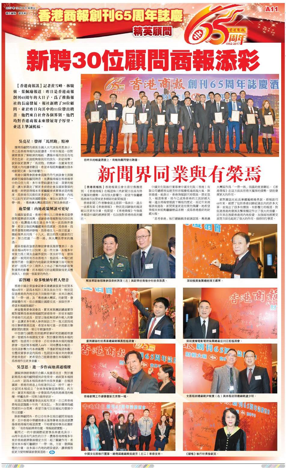 【香港商報网訊】記者黃雪峰、林駿強、葉佩瑜報道:昨日是香港商報創刊65周年的大日子,為了推動報社的長遠發展,報社新聘了30位顧問,並於昨日向其中的11位發出聘書。他們來自社會各個界別,他們均對香港商報未來發展寄予厚望,並送上摯誠祝福。
