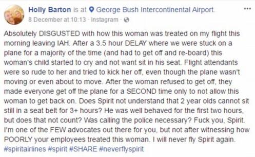 巴顿称,当这位女士拒绝下机,精神航空下令所有乘客全部离开机舱,然后再次登机,只是为了不让这家人再登机。巴顿的留言有数千人点赞,她自己和许多回应者都称“不会再搭乘精神航空”。但也有少数人认同精神航空的做法,有的说,“搭机最怕孩子吵,干嘛带小孩上飞机?”有的则称,“起飞前坐回自己的位子系安全带既然是规定,就要遵守。”