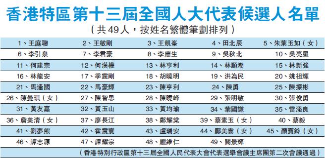 當天,會議由主席團常務主席林鄭月娥主持,她作了關於香港第十三屆全國人大代表候選人提名情況的報告。主席團經過審查,有58名年滿18周歲的香港特別行政區居民中的中國公民送交了參選人登記表和10名以上選舉會議成員分別為其填寫的候選人提名信,確認其中的49人符合代表候選人條件。根據選舉辦法的規定,主席團確認該49人為香港第十三屆全國人大代表候選人。會議決定公布候選人名單(見表)及其簡介(刊A16版)。