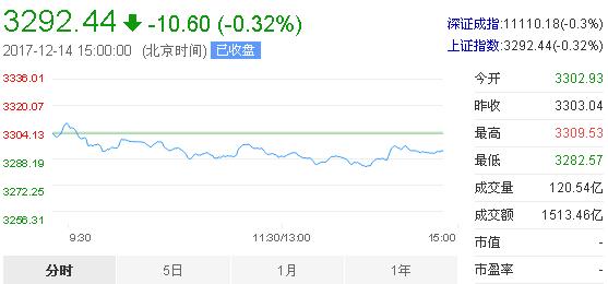 12月14日消息,沪深两市早盘双双低开,沪指起先维持横盘震荡,成交两随分时走势逐渐降低,创指与沪指走势变化不大,随后两市开始接连走低,临近中午收盘,沪指有所拉升,临近尾盘,券商板块集体拉升但沪指并未借此站上3300点大关。截止收盘,沪指报3292.44,跌0.32%,创指报1794.34,跌0.65%。