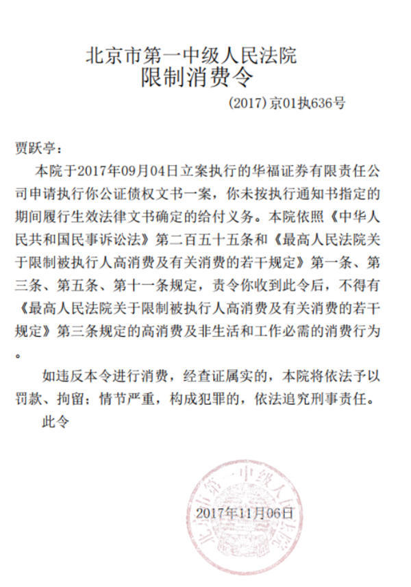 根據11月6日發布的限制消費令文書,北京市第一中級人民法院於9月4日執行的華福證券有限責任公司申請執行賈躍亭公證債券文書一案,賈躍亭未按執行通知書指定的期間履行生效法律文書確定的給付義務,責令賈躍亭在收到此令後,不得有《最高人民法院關於限制被執行人高消費及有關消費的若幹規定》第三條規定的高消費及非生活和工作必須的消費行為。