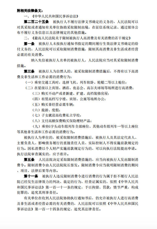 新聞附件:北京市第一中級人民法院下發給賈躍亭的限制消費令中附有的相關法律條文