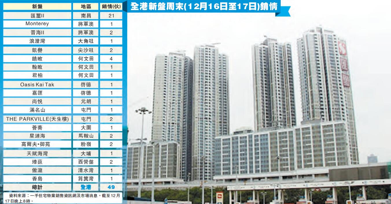 【香港商報网訊】記者葉子睿報道:由於臨近聖誕節長假期,入市氣氛不高,過去的一個周末缺乏大型新盤銷售下,本港一手住宅銷量大幅下跌。綜合物業銷售網及市場消息,截至昨日晚上8時,新盤周末(16日至17日)售出約49伙,較前一周的98伙下跌一半。其中新鴻基地產(016)與港鐵(066)合作的南昌站項目「匯璽II」,於周六、日一共售出21伙,佔周末一手樓市超過四成,再次獨佔鰲頭。