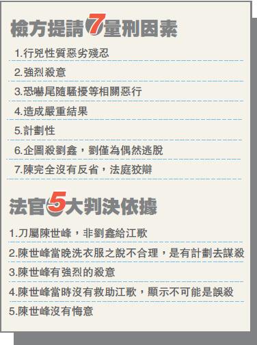 而根據有關證據,法官判定刀是陳世峰帶來的,不是江歌或證人劉鑫的,陳在法庭不斷試圖將責任轉嫁,完全沒有反省之意。判決書陳述了作案過程,指出陳殺人具有計劃性,情節惡劣,并且所傷無辜。陳開始就抱有強烈殺意,辯解不可信,不能采納陳方律師說法。此外,劉鑫於13日通過視頻出庭,報道稱其證詞存在前后不一的情况。
