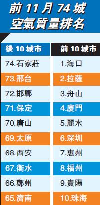 環保部同時公布了11月74城空氣質量排名,其中空氣質量最差的是太原,最好的是舟山。而綜合74個城市空氣質量前11月數據來看,空氣質量排在后10位的城市集中在北方地區,河北有6城上榜。空氣質量相對較好的前10城則大多在南方,廣東有3城市上榜。