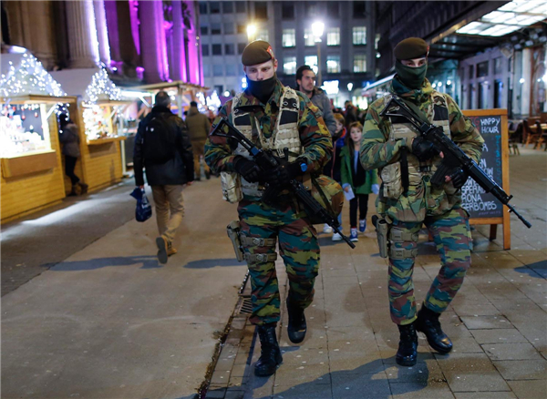 在比利时布鲁塞尔圣诞市集,士兵加强巡逻,以防恐袭发生。网络图片