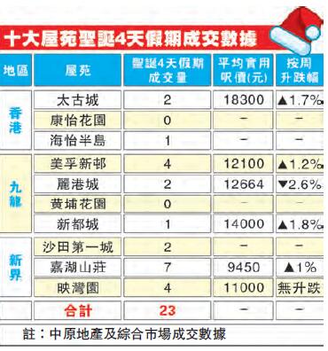 【香港商報网訊】記者曾浩榮報道:中原地產亞太區副主席兼住宅部總裁陳永傑表示,總結聖誕4天長假期(23日至26日),10大屋苑共錄23宗二手成交,單是周六日(23日至24日)已有13宗,連續6個周末企穩於雙位數水平。