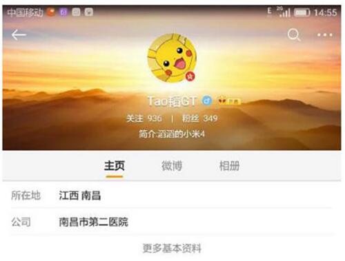 @TAO韬GT微博简介显示,其任职于南昌市第二医院,从其微博发布的一张题为“我最帅”的自拍照来看,头戴耳机,鼻架黑框眼镜,身着黑色T恤,背黑色双肩包,打扮颇为时髦,年龄应在30岁以下。