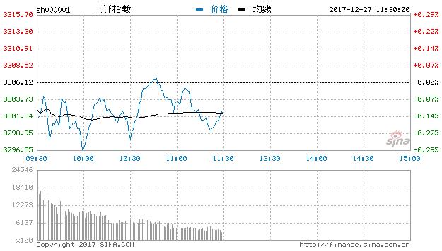 新浪财经讯 12月27日消息,三大股指早盘小幅低开后窄幅震荡。早盘,有色板块拉升之后,黑色系随之而动。沪指围绕平盘线窄幅震荡,深成指上午冲高力度不足随后持续震荡,创业板走势大体相同。临近上午收盘,两市出现小幅下跌,沪指在平盘线下方震荡,深成指与创指走势大体相同,呈现震荡格局。盘中,贵州燃气(16.860, 1.53, 9.98%)六连板,11个交易日股价翻倍;在董事长“愿景”的争议声中复牌,泰和集团封涨停板,股价创年初以来新高,截止收盘,沪指报3301.79,跌0.13%;深成指报11003.24,跌0.17%;创指报1755.82,跌0.17%。