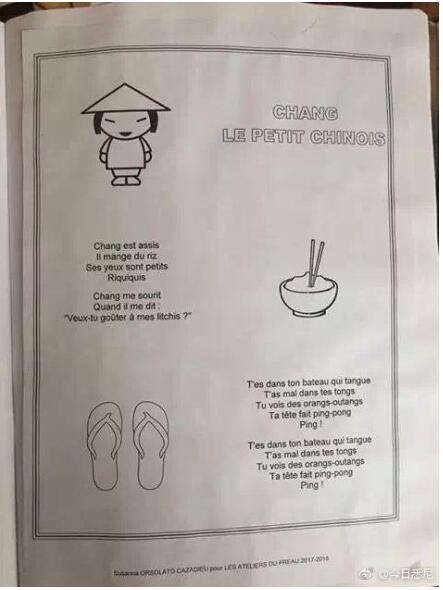 据法国《20分钟报》2017年12月30日报道,这一歌曲名为《张,我的矮个中国人》,歌词中充满侮辱华人的内容,包括“张坐着吃米饭,他的眼睛真小,小得好可怜”“坐在摇晃的小船中,脑袋晃荡如乒乓球砰砰响”。《费加罗报》称,巴黎郊区欧贝赫维利耶市一家幼儿园教授孩子们吟唱该歌曲超过10年,一些震惊的亚裔家长近日将它上传到社交网上才引发舆论关注。
