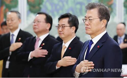文在寅于今年首次国务会议上向国旗行礼(图片来源:韩联社)