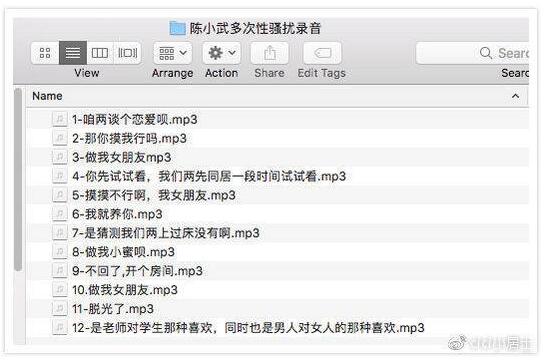 罗茜茜称,在水果硬糖群在讨论时,女生B主动透露了她有录音。在她连续被性骚扰的两年里,为了自保,她迫不得已买了录音设备,断断续续录了一些被性骚扰的过程。女生B提供的音频片段有12段音频。在音频片段里,陈小武多次提出让女学生做他女朋友,小蜜,提议同居等等。事后,女生B又私下给我发了一个几分钟的音频片段,该音频中,陈小武在多次各种试探,各种挑逗后,甚至企图强亲女生B,被女生B尴尬地挡回去了。